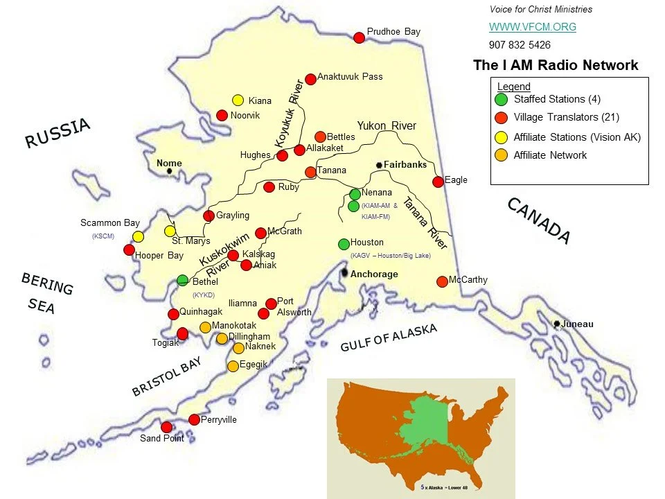 Translator Status: Voice for Chirst Ministries submitted an application to construct a translator station in Aniak in March of 2003. Final approval of that application was not granted by the Federal Communications Commission until November, 2013. The station was originally intended to be a satellite-fed repeater for the I-AM network's flagship station, KIAM. The arrival of high-speed internet service in the village made it technically possible to instead rebroadcast the programming of KYKD in Bethel, a station much more geographically and culturally related to Aniak than KIAM in Nenana, some 400 miles away in the central-interior of the state. In Febuary of 2014 special donations provided sufficient resources to purchase the required equipment and the Aniak Community Church agreed to host the station. Construction was completed on April 25th, 2014, when K232ER began broadcasting on 94.3 MHz.